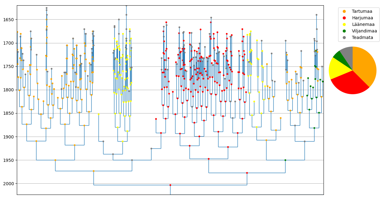 Allolev joonisel ongi näha minu kõugutabel, kus iga punkt on inimene ja ühendused näitavad eelnevust/järgnevust. Y-telg näitab inimese sünniaastat ja värv näitab sünniasukohta. Inspiratsiooni on võetud siit.